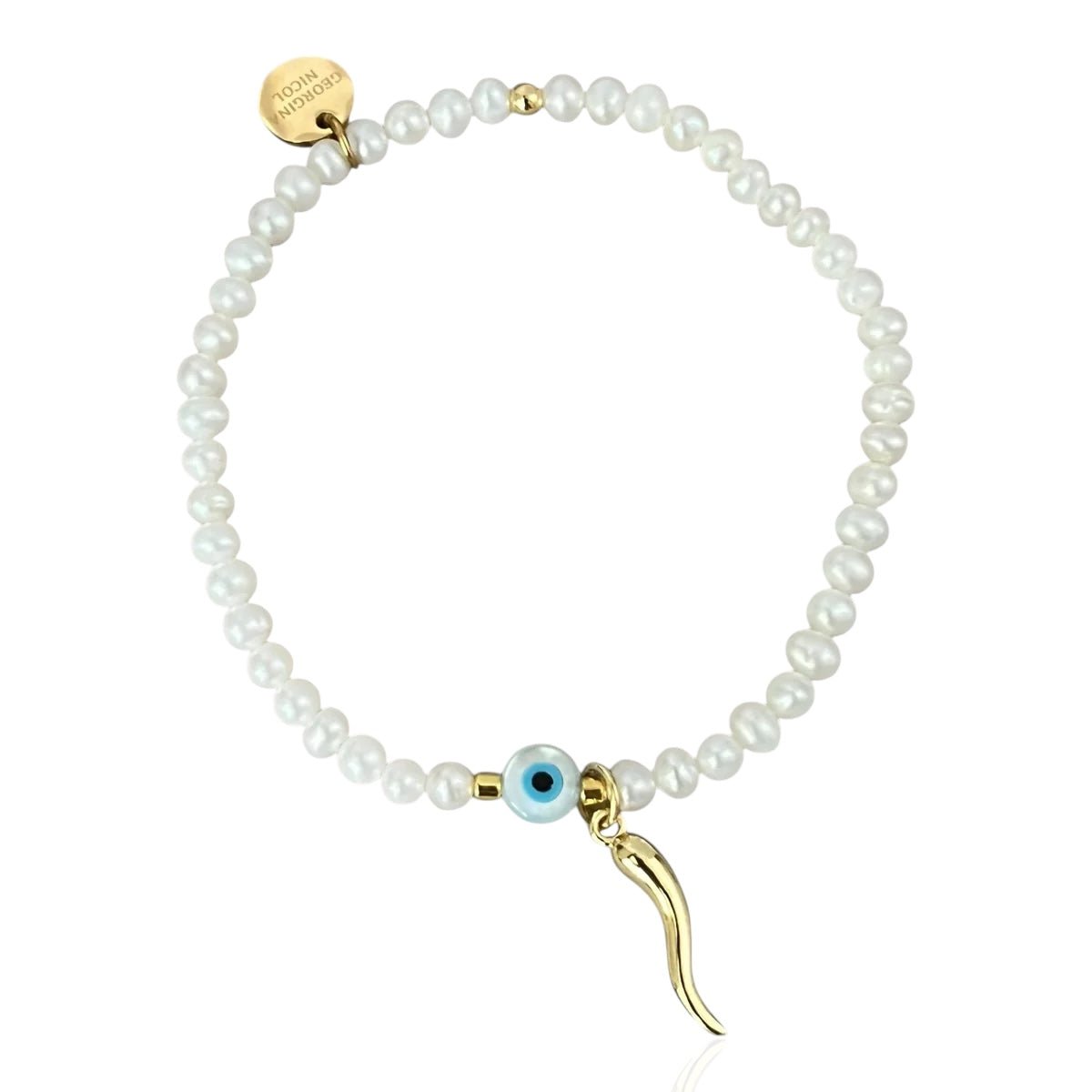 Handmade bracelet crafted with genuine freshwater pearls, adorned with a mother of pearl evil eye and a gold Italian Cornicello charm. The pearls symbolize purity and harmony, the evil eye offers protection, and the cornicello brings good fortune. A meaningful piece that balances elegance and symbolism.
