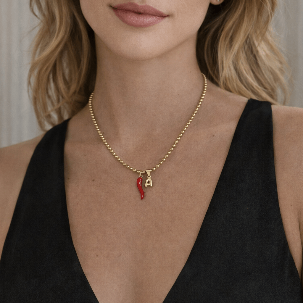 Handmade necklace featuring a red enamel cornicello paired with a mini bubble initial, both suspended from a gold bead necklace. The cornicello is a traditional symbol of protection and good luck, believed to help ward off negative energy, while the initial adds a personal touch that makes this piece feel meaningful and intentional. Designed to be worn daily, alone or layered, this necklace blends symbolism with a clean, modern aesthetic that feels timeless and personal.