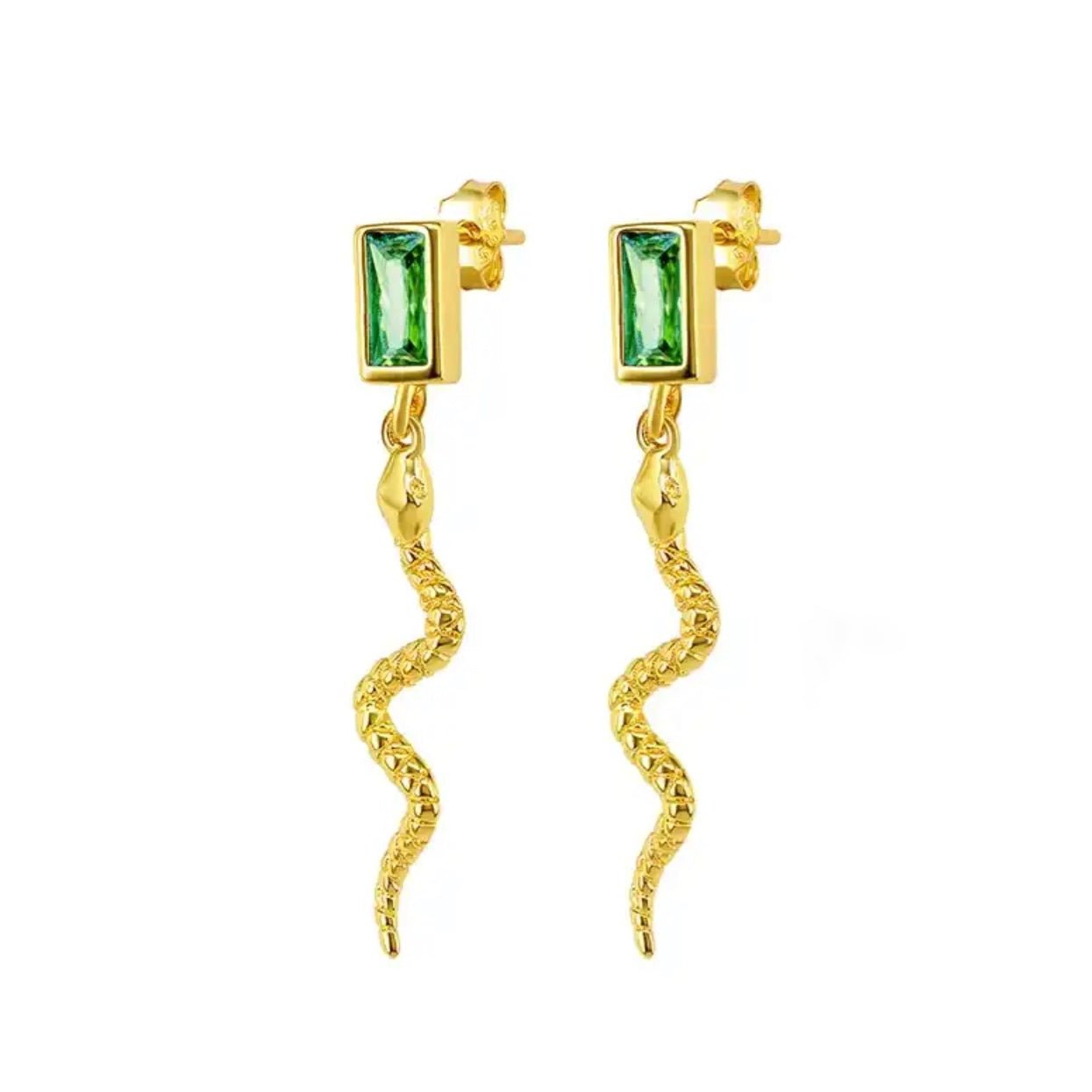 Introducing our Long Snake Earrings with Emerald Color Stones, crafted from 18k gold plated over 925 sterling silver and adorned with cubic zirconia. These earrings feature a stylish snake design complemented by vibrant emerald-colored stones, adding a touch of sophistication and allure to any outfit. Perfect for both casual and dressy occasions, pair them with a sleek black dress or a blouse and jeans ensemble for a chic look.