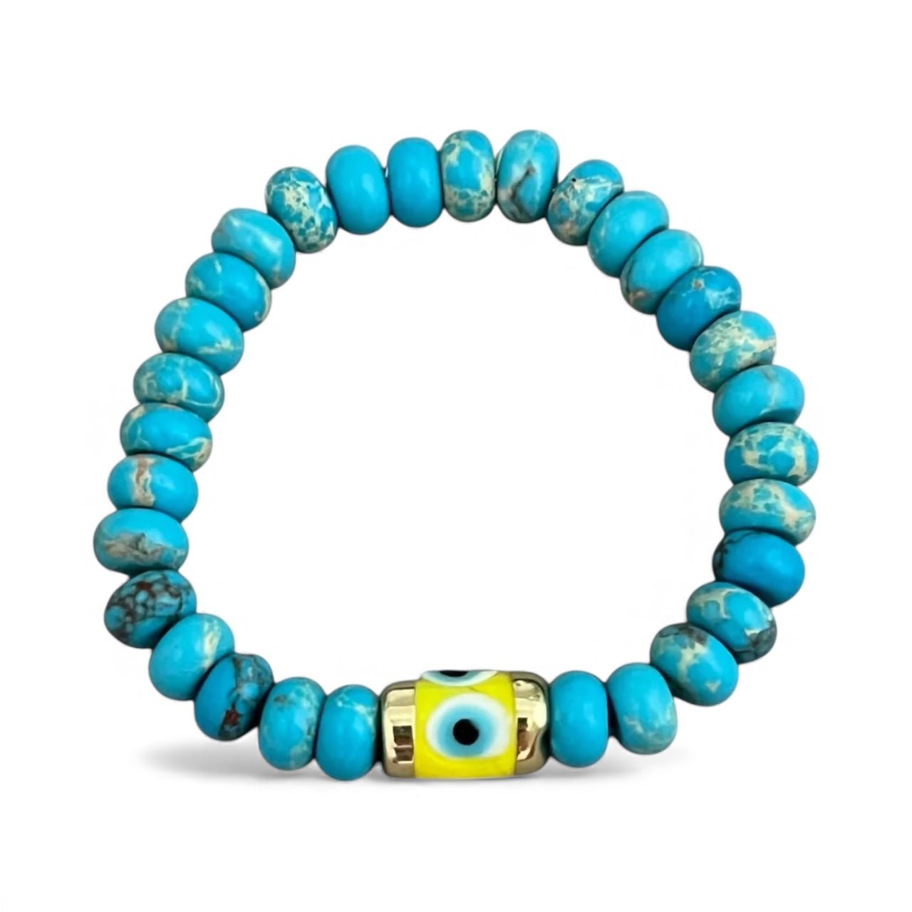 This vibrant turquoise beaded bracelet is centered with a yellow evil eye bead, a symbol of clarity, protection, and positive energy. Designed to be worn daily, it serves as both a style statement and a meaningful reminder of your strength and vision.